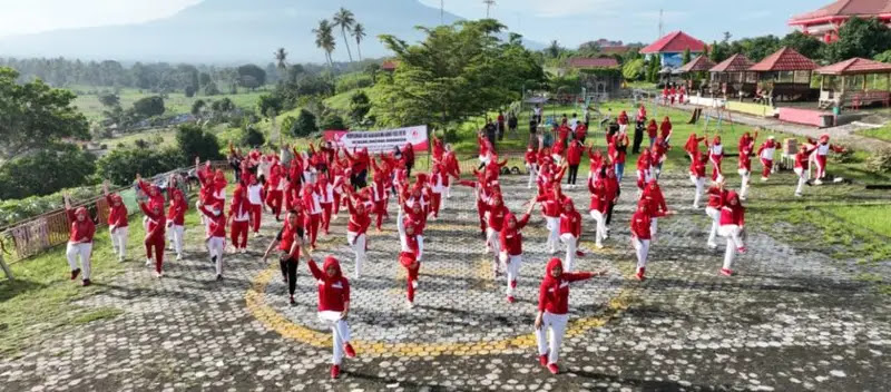 Dari Kabupaten Lampung Selatan, Ketua YJI Cabang Lampung Selatan Hj. Winarni Nanang Ermanto bersama Sekretaris Rosdiana dan jajaran pengurus lainnya mengikuti kegiatan senam jantung sehat dari Kebun Edukasi, rumah dinas bupati setempat, Sabtu (2/2/2024).